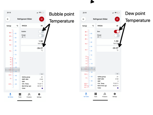 Let’s look at this on a refrigerant comparator, traditionally a handheld slider, but now much easier to use via apps such as the Danfoss Refrigerant Slider. If a system operates with suction pressure of 1.5 Barg, as it enters the evaporator, it starts to evaporate at a bubble point temperature of -26.27°C. Changing over to the dew point at the same system pressure, the last part of the refrigerant mixture liquid is evaporating at -22.37°C; this is the dew point.