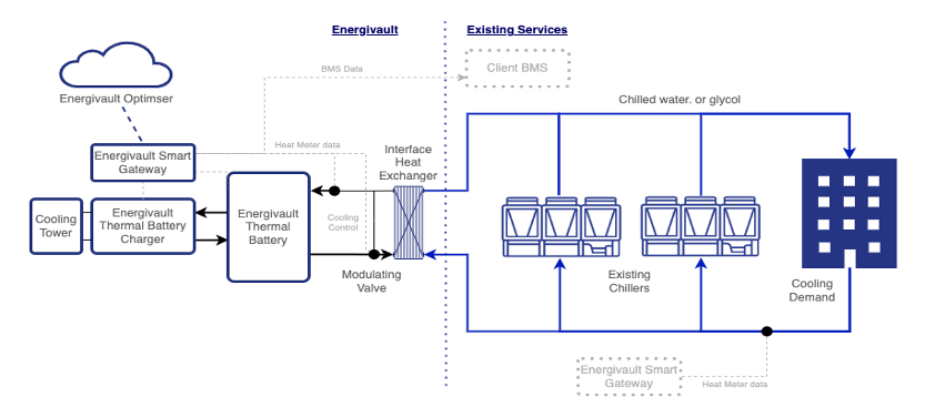 A schematic of EnergiVault illustrating its components, AI optimisation and integration with an existing building's chiller system