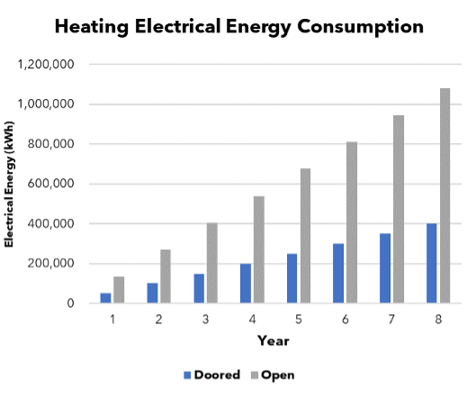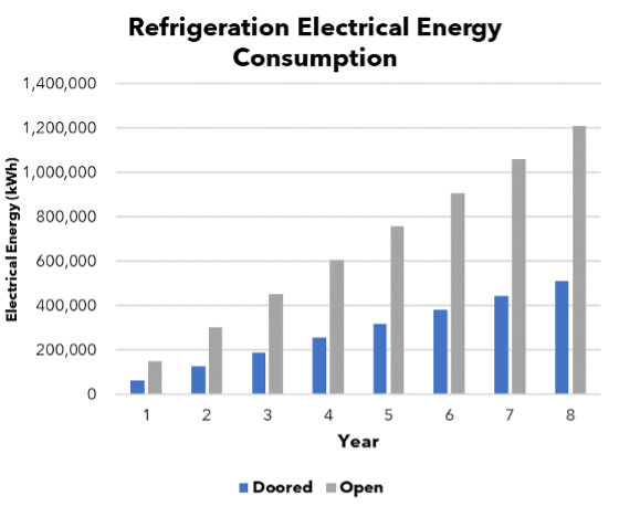 To measure the positive impact of doors, the graph below assesses the energy consumption of chilled open fronted display cases versus doored cases. Both the plant side and the direct electrical consumption (DEC) is included in the overall energy consumption modelling.