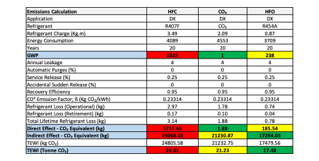 The graph below identifies the respective energy consumption and carbon emission of HFC, CO₂ and HFO refrigeration systems on a linear meter basis. The resultant effect is that HFO refrigeration systems when considering ASDA’s low refrigerant leak rate has the lowest Total Environmental Warming Impact (TEWI).
