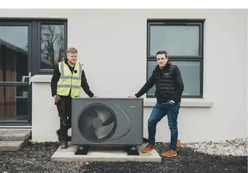 A 140m² bungalow in Glenavy uses a 9kW air source heat pump and 240L cylinder to deliver efficient heating and reliable hot water.