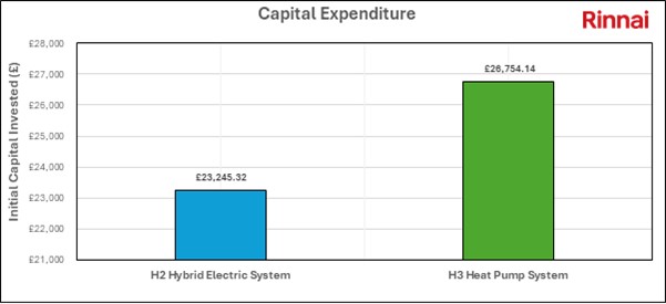 CAPEX costs associated with the H2 hybrid electric system will cost £23,245, the H3 heat pump system will cost £26,754, a 13% increase. The reason for the increase is that heat pumps can cost more than electric immersion cylinders. This gives the customer an option of reducing initial expenditure if budget constraints exist.