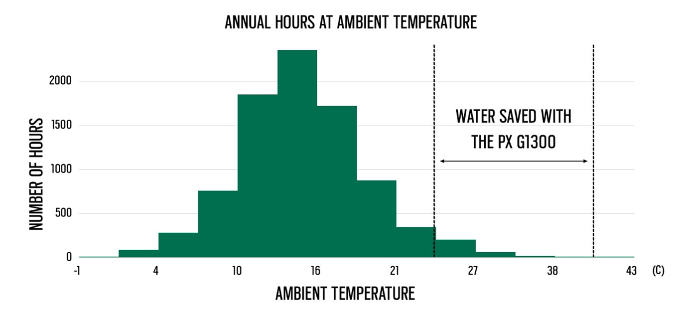 As an additional bonus, the PX G1300 also reduced energy consumption by up to 14% at 34°C, driving an estimated 19,000kWh of annual energy savings. It also enabled an approximately 9°C increase in design temperature to protect the CO₂ system against future heatwaves.