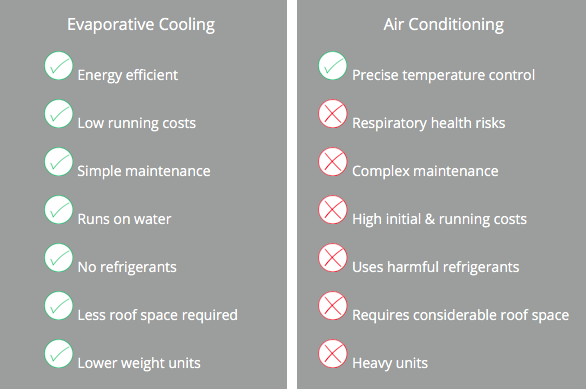 When cooling large areas, evaporative cooling is more cost-effective than traditional air conditioning. Not only is the initial capital outlay to design and install the system lower than conventional air conditioning, day-to-day running costs are lower due to the reduced energy demand from the sophisticated technology used in these coolers.
