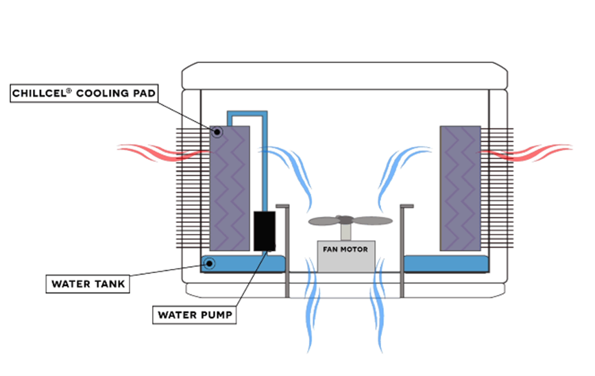 Fresh, filtered air enters the system and is pulled though a water-soaked cooling pad where the heat is absorbed, lowering the air temperature. Cooled air is distributed through the space via a fan and a series of ducts