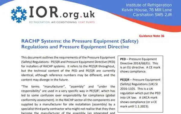 The Institute of Refrigeration (IOR) has released a new guidance note on the Pressure Equipment (Safety) Regulations and Pressure Equipment Directive (GN36) outlining the requirements for installers of RACHP systems.