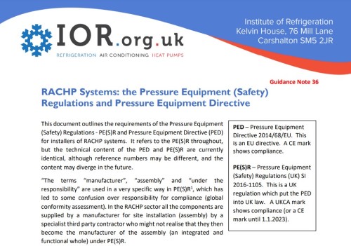 The Institute of Refrigeration (IOR) has released a new guidance note on the Pressure Equipment (Safety) Regulations and Pressure Equipment Directive (GN36) outlining the requirements for installers of RACHP systems.