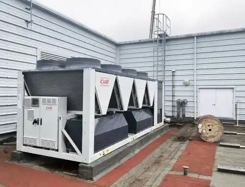 It replaced a previous CIAT unit at end of life. With a similar cooling capacity of 550 kW, the new chiller is significantly more compact, lightweight and energy-efficient than the previous model due to recent design improvements. Flow and return pipework connections were easily modified to fit the new system.