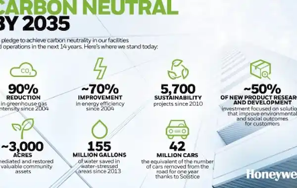 Honeywell says it has reduced its greenhouse gas intensity by more than 90% since 2004 and aims to complete more energy savings projects, converting to renewable energy sources, completing capital improvement projects in its sites, electrifying its fleet of company vehicles and using credible carbon offsets.