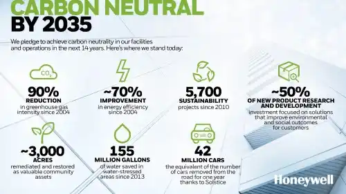 Honeywell says it also wants to help other companies and customers reach carbon neutrality through its products and technologies. It says its Solstice line of low global warming potential refrigerants, propellants and solvents has avoided emission of over 200 million metric tons of carbon dioxide equivalent from being released in the atmosphere according to our estimates, equivalent to removing more than 42 million cars from the road for one year.